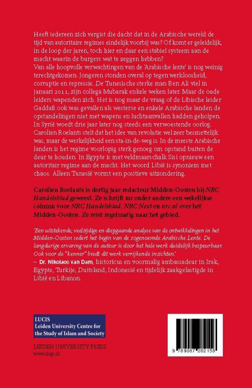 Heeft iedereen zich vergist die dacht dat in de Arabische wereld de tijd van autoritaire regimes eindelijk voorbij was? Of komt er geleidelijk, in de loop der jaren, toch hier en daar een stabiel systeem aan de macht waarin de burgers wat te zeggen hebben? Van alle hoopvolle verwachtingen van de 'Arabische Lente' is nog weinig terechtgekomen. Jongeren stonden overal op tegen werkloosheid, corruptie en repressie. De Tunesische sterke man Ben Ali viel in januari 2011, zijn collega Mubarak enkele weken later. Maar de oude leiders wapenden zich. Het is nog maar de vraag of de Libische leider Gaddafi ook was gevallen als westerse en enkele Arabische landen de opstandelingen niet met wapens en luchtaanvallen hadden geholpen. In Syrië woedt drie jaar later nog steeds een verwoestende oorlog. Carolien Roelants stelt dat het idee van revolutie wel zeer besmettelijk was, maar de werkelijkheid een sta-in-de-weg is. In de meeste Arabische landen is het regime voorlopig sterk genoeg om opstand buiten de deur te houden. In Egypte is met veldmaarschalk Sisi opnieuw een autoritair regime aan de macht. Het woord Libië is synoniem met chaos. Alleen Tunesië vormt een positieve uitzondering.