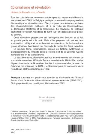 Au royaume du Rwanda, mandaté par l'ONU, la Belgique pratique un colonialisme progressiste, démocratique et révolutionnaire. En effet, le Royaume de Belgique soutient la Révolution rwandaise de 1959-1961 et l'accession des "petits" au pouvoir. Le deuxième tome, Révolution, retrace les évènements qui mènent de la mort du mwami en 1959 à la Terreur rwandaise de 1963-1964, via les déguerpissements de Novembre, les élections communales, les missions de l'ONU, la naissance de la République et l'Indépendance de 1962.