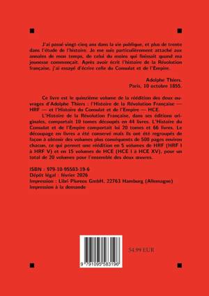 Parue entre 1845 et 1862, l'Histoire du Consulat et de l'Empire constitue l'autre grande fresque historique d'Adolphe Thiers. Poursuivant le récit engagé dans son Histoire de la Révolution française, l'auteur retrace avec minutie les années qui mènent de Brumaire à la chute de Napoléon. Fondée sur un vaste travail documentaire, l'oeuvre allie précision historique et ampleur narrative, offrant l'une des premières grandes synthèses consacrées à l'époque napoléonienne. Elle demeure un jalon majeur de l'historiographie du XIXe siècle et un témoignage essentiel de la construction de la mémoire napoléonienne.