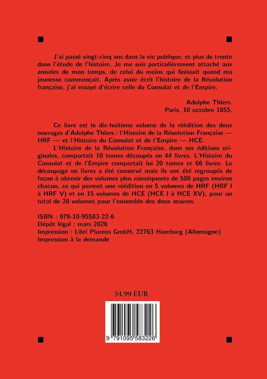 Parue entre 1845 et 1862, l'Histoire du Consulat et de l'Empire constitue l'autre grande fresque historique d'Adolphe Thiers. Poursuivant le récit engagé dans son Histoire de la Révolution française, l'auteur retrace avec minutie les années qui mènent de Brumaire à la chute de Napoléon. Fondée sur un vaste travail documentaire, l'oeuvre allie précision historique et ampleur narrative, offrant l'une des premières grandes synthèses consacrées à l'époque napoléonienne. Elle demeure un jalon majeur de l'historiographie du XIXe siècle et un témoignage essentiel de la construction de la mémoire napoléonienne.