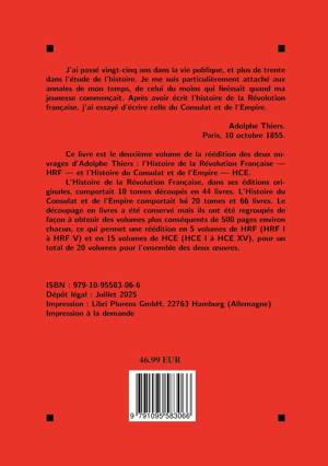 Parue entre 1845 et 1862, l'Histoire du Consulat et de l'Empire constitue l'autre grande fresque historique d'Adolphe Thiers. Poursuivant le récit engagé dans son Histoire de la Révolution française, l'auteur retrace avec minutie les années qui mènent de Brumaire à la chute de Napoléon. Fondée sur un vaste travail documentaire, l'oeuvre allie précision historique et ampleur narrative, offrant l'une des premières grandes synthèses consacrées à l'époque napoléonienne. Elle demeure un jalon majeur de l'historiographie du XIXe siècle et un témoignage essentiel de la construction de la mémoire napoléonienne.