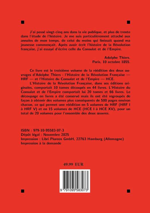 Publiée entre 1823 et 1827, l'Histoire de la Révolution française est la première grande synthèse historique consacrée à cet événement majeur. Adolphe Thiers y retrace, dans un récit à la fois précis et vivant, les étapes de la Révolution, de 1789 à l'avènement de Bonaparte. L'ouvrage, qui connut un immense succès au XIXe siècle, demeure un témoignage essentiel de l'historiographie romantique et un jalon incontournable pour quiconque s'intéresse à l'histoire de la Révolution et à sa réception.