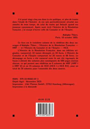 Parue entre 1845 et 1862, l'Histoire du Consulat et de l'Empire constitue l'autre grande fresque historique d'Adolphe Thiers. Poursuivant le récit engagé dans son Histoire de la Révolution française, l'auteur retrace avec minutie les années qui mènent de Brumaire à la chute de Napoléon. Fondée sur un vaste travail documentaire, l'oeuvre allie précision historique et ampleur narrative, offrant l'une des premières grandes synthèses consacrées à l'époque napoléonienne. Elle demeure un jalon majeur de l'historiographie du XIXe siècle et un témoignage essentiel de la construction de la mémoire napoléonienne.