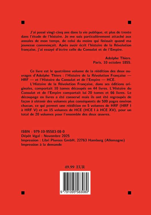 Publiée entre 1823 et 1827, l'Histoire de la Révolution française est la première grande synthèse historique consacrée à cet événement majeur. Adolphe Thiers y retrace, dans un récit à la fois précis et vivant, les étapes de la Révolution, de 1789 à l'avènement de Bonaparte. L'ouvrage, qui connut un immense succès au XIXe siècle, demeure un témoignage essentiel de l'historiographie romantique et un jalon incontournable pour quiconque s'intéresse à l'histoire de la Révolution et à sa réception.