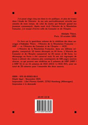 Parue entre 1845 et 1862, l'Histoire du Consulat et de l'Empire constitue l'autre grande fresque historique d'Adolphe Thiers. Poursuivant le récit engagé dans son Histoire de la Révolution française, l'auteur retrace avec minutie les années qui mènent de Brumaire à la chute de Napoléon. Fondée sur un vaste travail documentaire, l'oeuvre allie précision historique et ampleur narrative, offrant l'une des premières grandes synthèses consacrées à l'époque napoléonienne. Elle demeure un jalon majeur de l'historiographie du XIXe siècle et un témoignage essentiel de la construction de la mémoire napoléonienne.