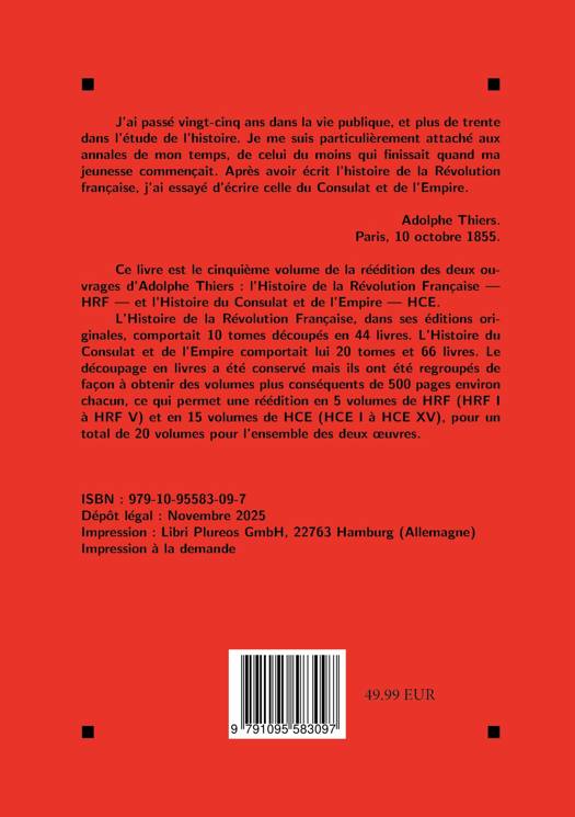 Volume V/XX (HRF V) : Ce cinquième volume nous emmène jusqu'à la journée du dix-huit brumaire et l'institution du consulat provisoire. C'est le dernier volume de l'Histoire de la Révolution française.