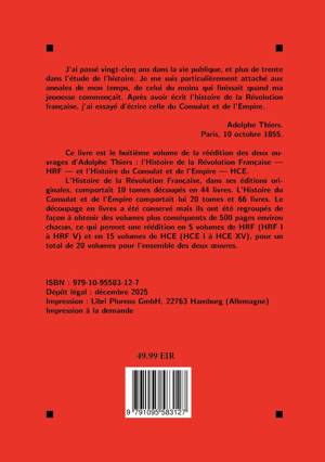 Publiée entre 1823 et 1827, l'Histoire de la Révolution française est la première grande synthèse historique consacrée à cet événement majeur. Adolphe Thiers y retrace, dans un récit à la fois précis et vivant, les étapes de la Révolution, de 1789 à l'avènement de Bonaparte. L'ouvrage, qui connut un immense succès au XIXe siècle, demeure un témoignage essentiel de l'historiographie romantique et un jalon incontournable pour quiconque s'intéresse à l'histoire de la Révolution et à sa réception. Parue entre 1845 et 1862, l'Histoire du Consulat et de l'Empire constitue l'autre grande fresque historique d'Adolphe Thiers. Poursuivant le récit engagé dans son Histoire de la Révolution française, l'auteur retrace avec minutie les années qui mènent de Brumaire à la chute de Napoléon. Fondée sur un vaste travail documentaire, l'oeuvre allie précision historique et ampleur narrative, offrant l'une des premières grandes synthèses consacrées à l'époque napoléonienne. Elle demeure un jalon majeur de l'historiographie du XIXe siècle et un témoignage essentiel de la construction de la mémoire napoléonienne.