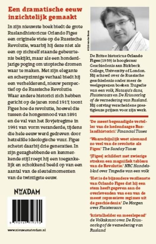 In zijn nieuwste boek biedt de grote Ruslandhistoricus Orlando Figes een originele visie op de Russische Revolutie, waarbij hij deze historische omwenteling niet als een op zichzelf staande gebeurtenis bekijkt, maar als een honderdjarige poging om utopische dromen waar te maken. Met zijn elegante en scherpzinnige verhaal biedt hij een verhelderend, nieuw perspectief op de Russische Revolutie. Waar andere historici zich hebben gericht op de jaren voor en na 1917, toont Figes hoe de revolutie, hoewel die tussen de hongersnood van 1891 en de val van het Sovjetregime in 1991 van vorm veranderde, tijdens die hele eeuw werd gedreven door hetzelfde ideologische vuur. Figes schetst daarbij drie generaties. In zijn gezaghebbende en kenmerkende stijl roept hij een toegankelijk en schokkend beeld op van een aantal van de sleutelmomenten van de twintigste eeuw.