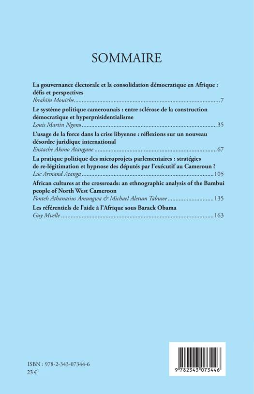 Sommaire : La gouvernance électorale et la consolidation démocratique en Afrique : défis et perspectives ; Le système politique camerounais : entre sclérose de la construction démocratique et hyper présidentialisme; L'usage de la force dans la crise libyenne : réflexions sur un nouveau désordre juridique international; La pratique politique des microprojets parlementaires : stratégies de re-légitimation et hypnose des députés par l'exécutif au Cameroun ?; African cultures at the crossroads : an ethnographic analysis of the Bambui people of North West Cameroon; Les référentiels de l'aide à l'Afrique sous Barack Obama.