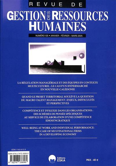 1/ La régulation managériale et des équipes en contexte multiculturel : le cas d'un hypermarché en Nouvelle-Calédonie 2/ Quand le projet territorial soulève la question du macro-talent management : enjeux, difficultés et perspectives. 3/ Compétence et dyslexie dans les organisations : des schèmes de pensée spécifiques au service de l'élaboration d'une compétence idiosyncratique. 4/ Well-being at work and individual performance : the case of multinational firms in a developping economy