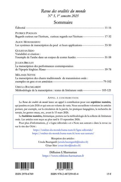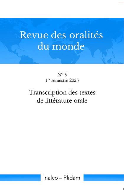 La Revue des oralités du monde a pour objectif de faire connaître les travaux de recherche dans le domaine des oralités et d’en renouveler les approches théoriques et méthodologiques. Elle publie des numéros thématiques et des varia. Ce numéro thématique est consacré à la transcription de littératures orales, abordée sous différents angles : la genèse des écritures, le développement et les applications des graphies définies, la variabilité de l’énonciation, l’analyse ethnomusicologique, et l’inscription de la performance et de la communication directe dans le texte de littérature orale.
