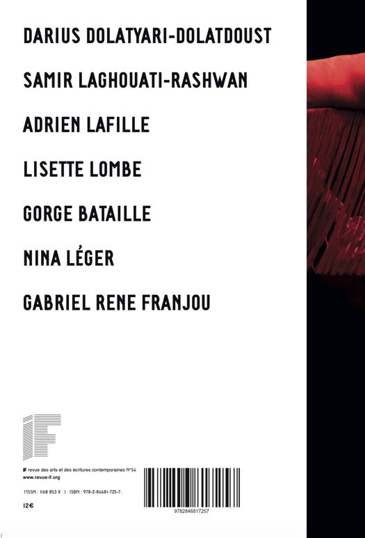 Ce numéro contient des textes inédits de Adrien Lafille, Gorge Bataille, Lisette Lombé, Nina Léger et Gabriel René Franjou ainsi que les portfolios des artistes et performeurs Darius Dolatyari-Dolatdoust et Samir Laghouati-Rashwan.