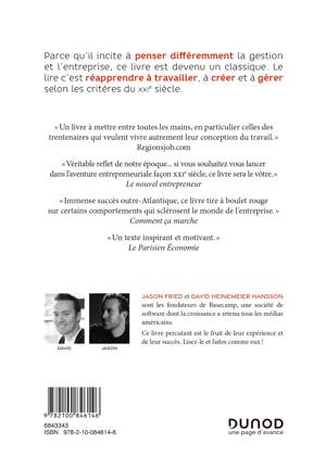 Derrière ce best-seller classé notamment dans les meilleures ventes du New York Times, on retrouve Jason Fried et David Heinemeier-Hansson, fondateurs de la société Basecamp (anciennement appelé 37signals), précurseurs de la création d'applications qui facilitent le travail.