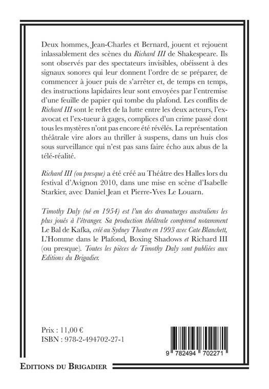Richard III (ou presque) a été créé au Théâtre des Halles lors du festival d’Avignon 2010, dans une mise en scène d’Isabelle Starkier, avec Daniel Jean et Pierre-Yves Le Louarn.