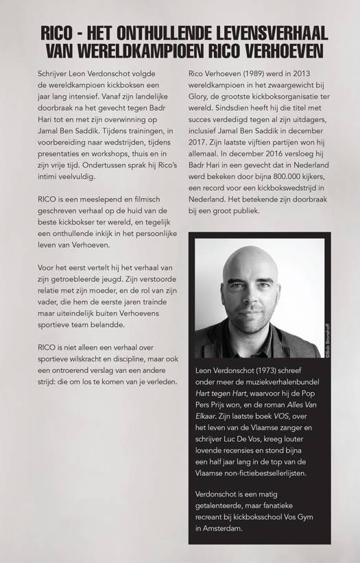 Het resultaat is RICO: niet alleen een meeslepend en filmisch geschreven verhaal op de huid van de beste kickbokser ter wereld, maar ook een onthullend inkijk in het persoonlijke leven van Verhoeven. Voor het eerst vertelt hij (en zijn intimi) het verhaal van zijn getroebleerde jeugd. Zijn verstoorde relatie met zijn moeder, en de rol van zijn vader, die hem de eerste jaren trainde maar uiteindelijk buiten Verhoevens sportieve team belandde. Het legde de basis voor een zeer gecompliceerde band, die onlangs tragisch eindigde met het overlijden van Verhoevens vader.