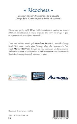Dix années que le souffle Déols éveille les talents et taquine les plumes affirmées, dix années qu'il caresse jusqu'aux plus lointains rivages et qu'il en rapporte un écho toujours renouvelé...Tandis qu'Alexandrine Descotes, nouvelle George Sand 2014, nous entraine dans l'étrange sillage des Inconnus du Pont Neuf, Marine Westphal, lauréate du prix jeune pour Ou bien sombrer, Valérie Benguezal et ses Méandres et Sabine Aussenac avec Les mains de Baptistin livrent également de saisissants ricochets...