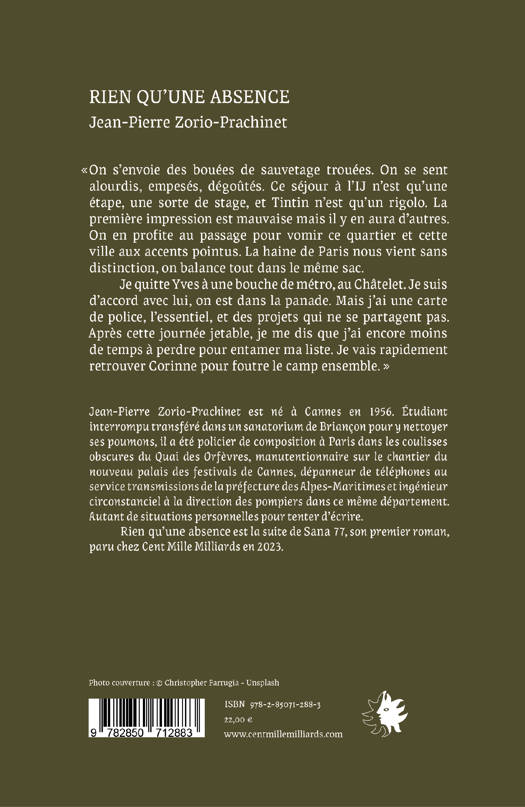 Jean-Pierre Zorio-Prachinet est né à Cannes en 1956. Étudiant interrompu transféré dans un sanatorium de Briançon pour y nettoyer ses poumons, il a été policier de composition à Paris dans les coulisses obscures du Quai des Orfèvres, manutentionnaire sur le chantier du nouveau palais des festivals de Cannes, dépanneur de téléphones au service transmissions de la préfecture des Alpes-Maritimes et ingénieur circonstanciel à la direction des pompiers dans ce même département. Autant de situations personnelles pour tenter d’écrire. Rien qu’une absence est la suite de Sana 77, son premier roman, paru chez Cent Mille Milliards en 2023.
