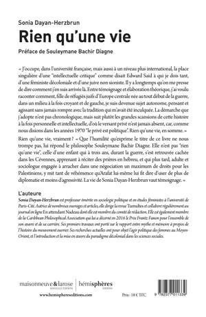 « J’occupe, dans l’université française, mais aussi à un niveau plus international, la place singulière d’une “intellectuelle critique” comme disait Edward Said à qui je dois tant, d’une féministe décoloniale et d’une juive non sioniste. Il y a longtemps qu’on me presse de dire comment j’en suis arrivée là. Entre témoignage et élaboration théorique, j’ai voulu raconter comment, fille de réfugiés juifs d’Europe centrale née au tout début de la guerre, dans un milieu à la fois croyant et de gauche, je suis devenue sujet autonome, pensant et agissant sans jamais rompre avec la tradition qui m’avait été inculquée. La démarche que j’adopte n’est pas chronologique, mais suit plutôt les grandes scansions de cette histoire à la fois personnelle et intellectuelle, d’où le versant privé n’est jamais absent, car, comme nous disions dans les années 1970, “le privé est politique”. Rien qu’une vie, en somme. » <br /><br /> « Finalement mes deux noms renvoient à toute mon histoire, faite d’arrachements, de continuités et de renouveau. Ils symbolisent la rencontre de ces deux mondes auxquels je me rattache : le passé ashkénaze venu du centre de l’Europe et dont la culture ne cesse de me nourrir, et puis ce Sud qu’on appelle aussi Orient, qui m’a tant apporté et qui m’est devenu un autre chez-moi. De l’Europe du Centre, si douloureusement familière, j’ai été définitivement chassée. Le monde arabe pour lequel j’ai ressenti tant d’attirance, s’effondre peu à peu, â¨dans une succession d’événements tragiques. Reste le travail de la pensée. »<br /><br /> Rien qu’une vie, vraiment ? « Que l’humilité qu’exprime le titre de ce livre ne nous trompe pas, lui répond le philosophe Souleymane Bachir Diagne. Elle n’est pas “rien qu’une vie”, celle d’une enfant qui à trois ans, durant la guerre, s’est retrouvée cachée dans les Cévennes, apprenant à réciter des prières en hébreu, et qui plus tard, adulte et sociologue engagée à arracher dans une négociation un maximum de droits pour les Palestiniens, y mit tant de véhémence qu’Arafat lui-même lui fit dire d’user de plus de diplomatie et moins d’agressivité. La vie de Sonia Dayan-Herzbrun vaut témoignage. »
