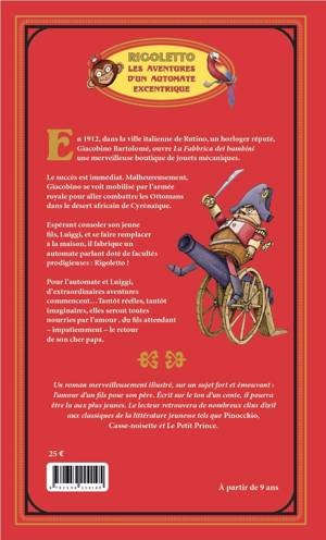 En 1912, dans la ville italienne de Rutino, un horloger réputé, Giacobino Bartolomé, ouvre La Fabbrica dei bambini une merveilleuse boutique de jouets mécaniques. Le succès est immédiat. Malheureusement,Giacobino se voit mobilisé par l'armée royale itailenne pour aller combattre les Ottomans dans le désert africain de Cyrénaïque.Espérant consoler son jeune fils, Luiggi, l'horloger fabrique pour celui-ci Rigoletto. Un automate exceptionnel: il est à la fois parlant mais aussi doté de facultés prodigieuses. Pour l'automate et Luiggi, d'extraordinaires aventurescommencent…Tantôt réelles, tantôt imaginaires, elles seront toutes nourries par l'amour, du fils attendant - impatiemment - le retour de guerre du cher papa.Un roman merveilleusement illustré, publié en grand format à la manière de la célèbre collection Hetzel, sur un sujet fort et émouvant :l'amour d'un fils pour son père. Écrit sur le ton d'un conte, il pourraêtre lu aux plus jeunes. Le lecteur reconnaitra de nombreux clins d'œilaux classiques de la littérature jeunesse tels que Pinocchio,Casse-noisette et Le Petit Prince.