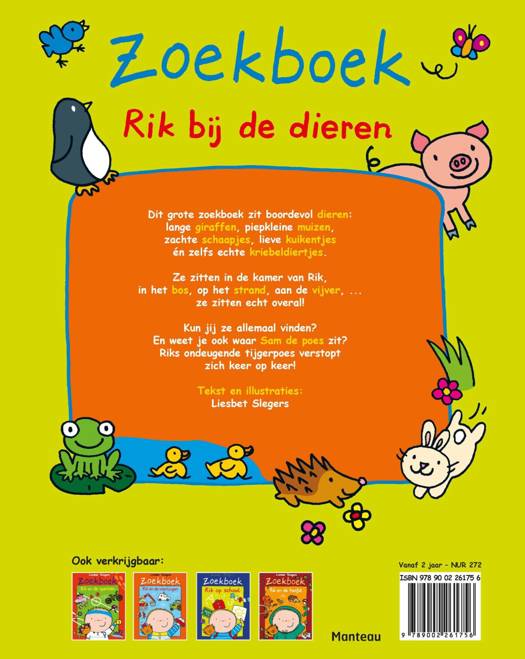 Dit grote zoekboek zit boordevol dieren: lange giraffen, piepkleine muizen, zachte schaapjes, lieve kuikentjes én zelfs echte kriebeldiertjes. Ze zitten in de kamer van Rik, in het bos, op het strand, aan de vijver, ... ze zitten echt overal! Kun jij ze allemaal vinden? En weet je ook waar Sam de poes zit? Riks ondeugende tijgerpoes verstopt zich keer op keer!
