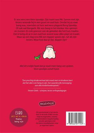 Er was eens een klein spookje. Zijn naam was Rik. Samen met zijn broers woonde hij in een groot en oud huis. Omdat hij zo vaak bang was, noemden ze hem wel eens plagend Bang Spookje. Of ook wel Bangerik. Rik was bang in het donker. Van spinnen en muizen. En ook gewoon van de geluiden die het huis maakte. Dat is lastig als je in een oud huis woont waar alles piept en kraakt. Maar op een dag wou Rik een dapper spook zijn, net als zijn broers. Maar hoe doe je dat, dapper zijn?