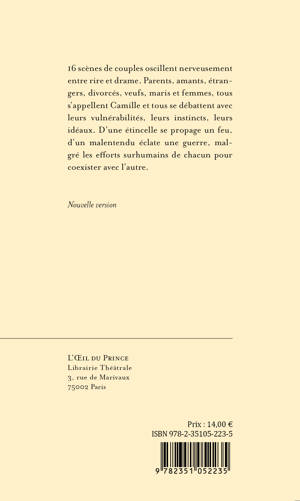16 scènes de couples oscillent nerveusement entre rire et drame. Parents, amants, étrangers, divorcés, veufs, maris et femmes, tous s’appellent Camille et tous se débattent avec leurs vulnérabilités, leurs instincts, leurs idéaux. D’une étincelle se propage un feu, d’un malentendu éclate une guerre, malgré les efforts surhumains de chacun pour coexister avec l’autre.