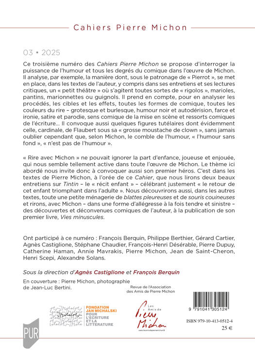 Ce troisième numéro des Cahiers Pierre Michon se propose d’interroger la puissance de l’humour et tous les degrés du comique dans l’oeuvre de Michon. Il analyse, par exemple, la manière dont, sous le patronage de « Pierrot », se met en place, dans les textes de l’auteur, y compris dans ses entretiens et ses lectures critiques, un « petit théâtre » où s’agitent toutes sortes de « rigolos », marioles, pantins, marionnettes ou guignols. Il prend en compte, pour en analyser les procédés, les cibles et les effets, toutes les formes de comique, toutes les couleurs du rire – grotesque et burlesque, humour noir et autodérision, farce et ironie, satire et parodie, sens comique de la mise en scène et ressorts comiques de l’écriture… Il convoque aussi quelques figures tutélaires dont évidemment celle, cardinale, de Flaubert sous sa « grosse moustache de clown », sans jamais oublier cependant que, selon Michon, le comble de l’humour, « l’humour sans fond », « n’est pas de l’humour ». « Rire avec Michon » ne pouvait ignorer la part d’enfance, joueuse et enjouée, qui nous semble tellement active dans toute l’oeuvre de Michon. Le thème ici abordé nous invite donc à convoquer aussi son premier héros. C’est dans les textes de Pierre Michon, à l’orée de ce Cahier, que nous lirons deux beaux entretiens sur Tintin – le « récit enfant » – célébrant justement « le retour de cet enfant triomphant dans l’adulte ». Nous découvrirons aussi, dans les autres textes, toute une petite ménagerie de blattes pleureuses et de souris couineuses et rirons, avec Michon – dans une forme d’allégresse à la fois tendre et sinistre – des découvertes et déconvenues comiques de l’auteur, à la publication de son premier livre, Vies minuscules.