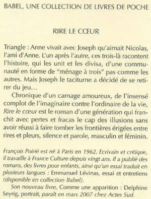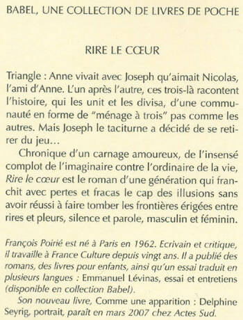 Triangle : Anne vivait avec Joseph qu'aimait Nicolas, l'ami d'Anne. L'un après l'autre, ces trois-là racontent l'histoire, qui les unit et les divisa, d'une communauté en forme de "ménage à trois" pas comme les autres. Mais Joseph le taciturne a décidé de se retirer du jeu... Chronique d'un carnage amoureux, de l'insensé complot de l'imaginaire contre l'ordinaire de la vie, Rire le coeur est le roman d'une génération qui franchit avec pertes et fracas le cap des illusions sans avoir réussi à faire tomber les frontières érigées entre rires et pleurs, silence et parole, masculin et féminin.