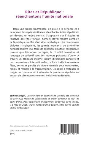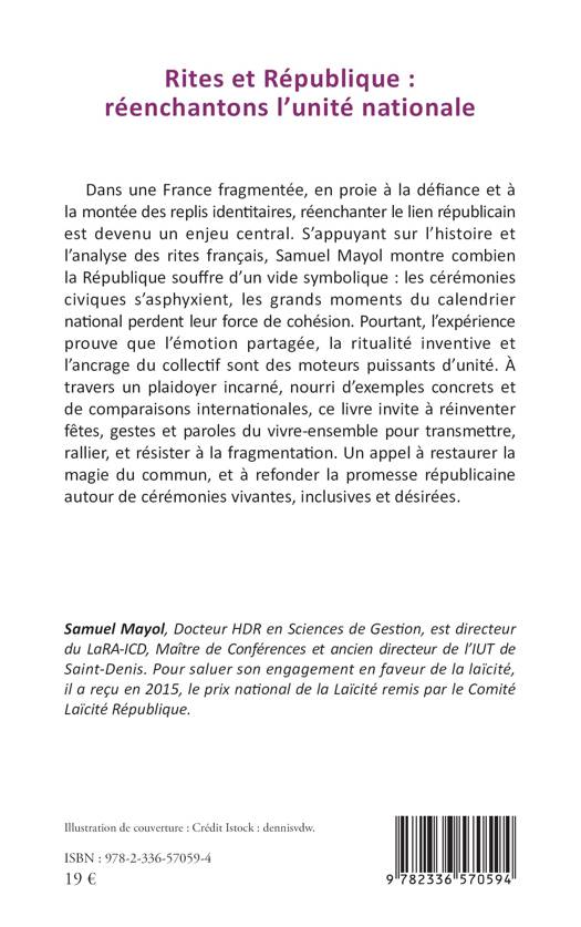 Dans une France fragmentée, en proie à la défiance et à la montée des replis identitaires, réenchanter le lien républicain est devenu un enjeu central. S'appuyant sur l'histoire et l'analyse des rites français, Samuel Mayol montre combien la République souffre d'un vide symbolique les cérémonies civiques s'asphyxient, les grands moments du calendrier national perdent leur force de cohésion. Pourtant, l'expérience prouve que l'émotion partagée, la ritualité inventive et l'ancrage du collectif sont des moteurs puissants d'unité. À travers un plaidoyer incarné, nourri d'exemples concrets et de comparaisons internationales, ce livre invite à réinventer fêtes, gestes et paroles du vivre-ensemble pour transmettre, rallier, et résister à la fragmentation. Un appel à restaurer la magie du commun, et à refonder la promesse républicaine autour de cérémonies vivantes, inclusives et désirées.