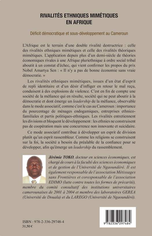 L'Afrique est le terrain d'une double rivalité destructrice : celle des rivalités ethniques mimétiques et celle des rivalités théoriques mimétiques. Les rivalités ethniques mimétiques, issues d'un état d'esprit de repli identitaire et d'un désir d'infliger en retour le mal reçu, conduisent à des explosions de violence. Les rivalités entretiennent les divisions et bloquent le développement. Or la société a besoin du préalable de la confiance pour se développer, afin qu'émerge un leadership du rassemblement.