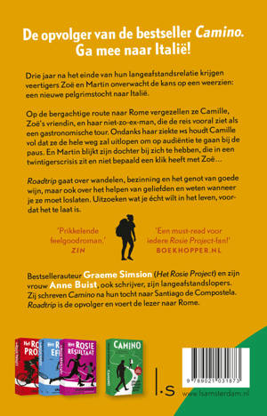 In Roadtrip van Graeme Simsion (Het Rosie Project) en Anne Buist volgen we veertigers Zoë en Martin. Drie jaar geleden liepen ze samen de Camino en op zoek naar zichzelf vonden ze elkaar. Toen hield hun relatie geen stand, nu krijgen ze een tweede kans als ze Zoë’s vriendin Camille vergezellen op weg naar Rome. Camille heeft MS en wil koste wat kost de lange voettocht volbrengen.