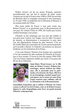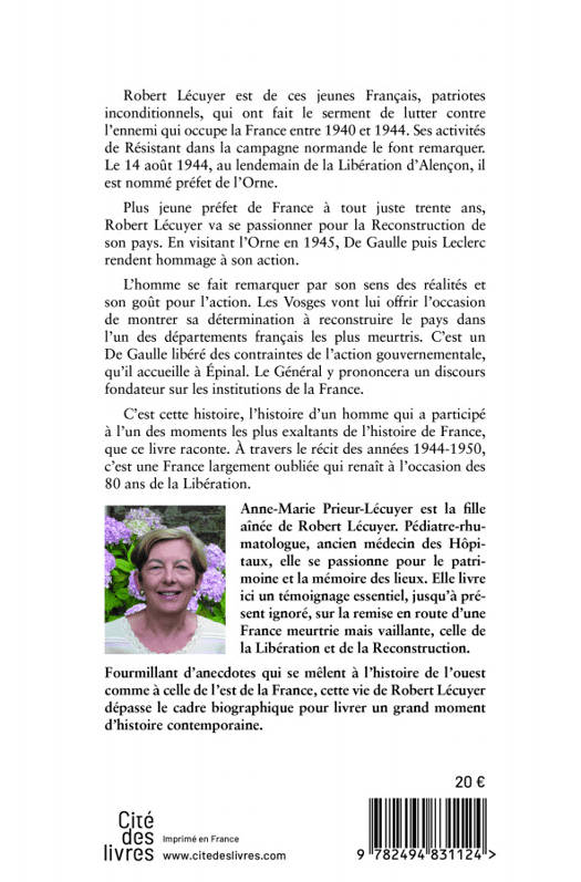 Robert Lécuyer est de ces jeunes Français, patriotes inconditionnels, qui ont fait le serment de lutter contre l’ennemi qui occupe la France entre 1940 et 1944. Ses activités de Résistant dans la campagne normande le font remarquer. Le 14 août 1944, au lendemain de la Libération d’Alençon, il est nommé préfet de l’Orne. <br /> Plus jeune préfet de France à tout juste trente ans, Robert Lécuyer va se passionner pour la Reconstruction de son pays. En visitant l’Orne en 1945, De Gaulle puis Leclerc rendent hommage à son action.<br /> L’homme se fait remarquer par son sens des réalités et son goût pour l’action. Les Vosges vont lui offrir l’occasion de montrer sa détermination à reconstruire le pays dans l’un des départements français les plus meurtris. C’est un De Gaulle libéré des contraintes de l’action gouvernementale, qu’il accueille à Épinal. Le Général y prononcera un discours fondateur sur les institutions de la France.<br /> C’est cette histoire, l’histoire d’un homme qui a participé à l’un des moments les plus exaltants de l’histoire de France, que ce livre raconte. À travers le récit des années 1944-1950, c’est une France largement oubliée qui renaît à l’occasion des 80 ans de la Libération.<br /> <br /> Anne-Marie Prieur-Lécuyer est la fille aînée de Robert Lécuyer. Pédiatre-rhumatologue, ancien médecin des Hôpitaux, elle se passionne pour le patrimoine et la mémoire des lieux. Elle livre ici un témoignage essentiel, jusqu’à présent ignoré, sur la remise en route d’une France meurtrie mais vaillante, celle de la Libération et de la Reconstruction. <br /> Fourmillant d’anecdotes qui se mêlent à l’histoire de l’ouest comme à celle de l’est de la France, cette vie de Robert Lécuyer dépasse le cadre biographique pour livrer un grand moment d’histoire contemporaine.