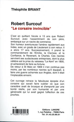 C'est en quittant l'école à 13 ans que Robert Surcouf, avec l'assentiment de son père, embarque sur un navire de commerce. Son humeur aventureuse l'amène rapidement aux Indes, avec un grade de Lieutenant à son retour. Il a alors 17 ans. Successivement, il prend le commandement de l'Emilie, la Clarisse, et la Confiance, le Revenant, le Charles. Ces navires servirent ses audacieuses entreprises, dont la plus célèbre est la prise du vaisseau "Le Kent" en 1800, et achevèrent de faire sa fortune. De retour à St Malo en 1809 il n'en continua pas moins, par les nombreux navires qu'il équipait, à faire une guerre acharnée aux Anglais, dont il était l'implacable ennemi. Cet ouvrage retrace la fabuleuse épopée d'un corsaire qui savait faire oublier ce que son caractère avait de brusque et d'emporté par une bonté réelle, par son humanité et par une générosité qui lui avait gagné l'affection de ces proches.