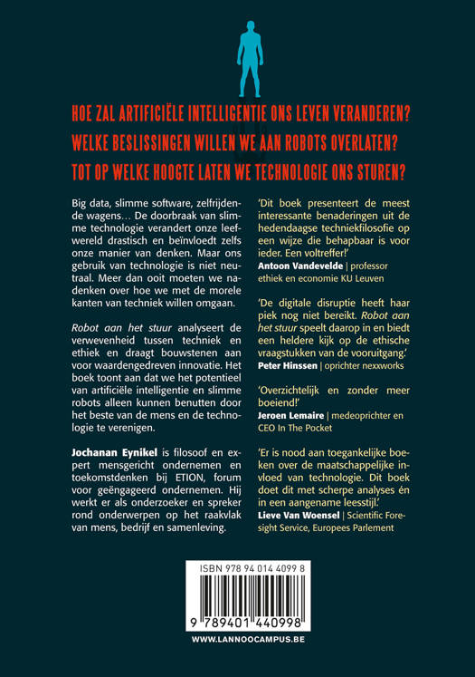 Nemen robots de wereld over? Big data, slimme software, zelfrijdende wagens... De doorbraak van slimme technologie verandert onze leefwereld drastisch en beïnvloedt zelfs onze manier van denken. Maar ons gebruik van technologie is niet neutraal. Meer dan ooit moeten we nadenken over hoe we met de morele kanten van techniek willen omgaan. Robot aan het stuur analyseert de verwevenheid tussen techniek en ethiek en draagt bouwstenen aan voor waardengedreven innovatie. Het boek toont aan dat we het potentieel van artificiële intelligentie en slimme robots alleen kunnen benutten door het beste van de mens en de technologie te verenigen.