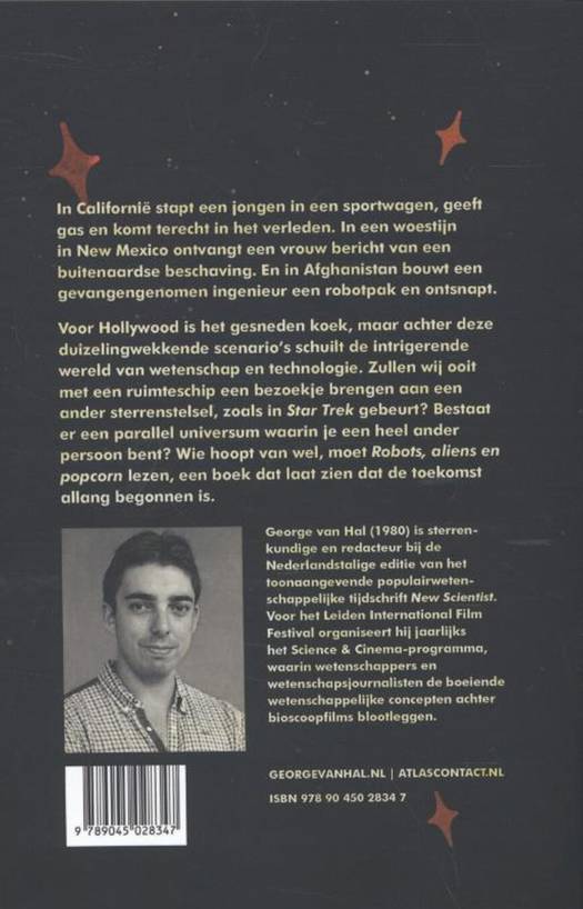 In Amerika stapt een jongen in een sportwagen, geeft gas en komt terecht in het verleden. In een woestijn in New Mexico ontvangt een vrouw bericht van een buitenaardse beschaving. En in Afghanistan bouwt een gevangengenomen ingenieur een robotpak en ontsnapt. Voor Hollywood is het gesneden koek, maar achter deze duizelingwekkende scenario's schuilt de intrigerende wereld van wetenschap en technologie. Zullen wij ooit als in Star Trek met een ruimteschip een bezoekje brengen aan een ander sterrenstelsel? Bestaat er een parallel universum waarin je een heel ander persoon bent? Wie hoopt van wel, moet Robots, aliens en popcorn lezen, een boek dat laat zien dat de toekomst allang begonnen is.