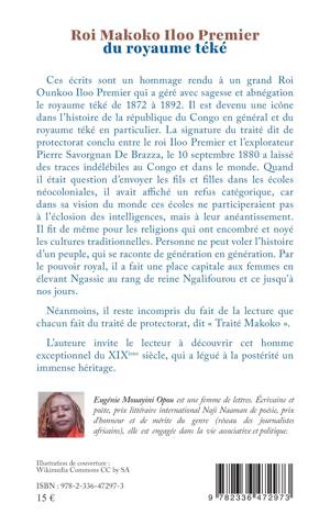 Ces écrits sont un hommage rendu à un grand Roi Ounkoo Iloo Premier qui a géré avec sagesse et abnégation le royaume téké de 1872 à 1892. Il est devenu une icône dans l'histoire de la république du Congo en général et du royaume téké en particulier. La signature du traité dit de protectorat conclu entre le roi Iloo Premier et l'explorateur Pierre Savorgnan De Brazza, le 10 septembre 1880 a laissé des traces indélébiles au Congo et dans le monde. Quand il était question d'envoyer les fils et filles dans les écoles néocoloniales, il avait affiché un refus catégorique, car dans sa vision du monde ces écoles ne participeraient pas à l'éclosion des intelligences, mais à leur anéantissement. Il fit de même pour les religions qui ont encombré et noyé les cultures traditionnelles. Personne ne peut voler l'histoire d'un peuple, qui se raconte de génération en génération. Par le pouvoir royal, il a fait une place capitale aux femmes en élevant Ngassie au rang de reine Ngalifourou et ce jusqu'à nos jours. Néanmoins, il reste incompris du fait de la lecture que chacun fait du traité de protectorat, dit Traité Makoko . L'auteure invite le lecteur à découvrir cet homme exceptionnel du XIXème siècle, qui a légué à la postérité un immense héritage.