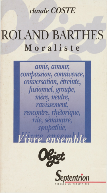 Que Barthes soit un moraliste relève d’une évidence. En suivant le continu moral du discontinu formel, en dessinant un cheminement dans la diversité de l’œuvre, ce livre se propose de donner corps à une impression première. « Éthique », terme moins compromis, en reste au plan des principes sans ouvrir forcément sur des préoccupations concrètes. « Morale » permet de placer au premier plan un « je », sujet complexe et fluctuant, qui se demande à partir de sa propre expérience d’homme, de lecteur et d’écrivain « comment vivre ensemble » (titre du premier cours de Barthes au Collège de France). La question très pratique du « que faire ? » engage la responsabilité de l’individu à l’égard de l’autre au sein d’un espace relationnel dominé par le langage. En proposant à la fois une écriture de la morale, une morale de l’écriture et une morale par l’écriture, Barthes considère le rapport entre auteur et lecteur comme la métaphore et le champ d’expérimentation de toutes les relations humaines possibles. Règles de vie et règles d’écriture entrent dans une relation fondamentale qui ouvre sur une pensée de la rhétorique et du contrat. L’engagement politique ou esthétique, la « subversion subtile », le « non-vouloir-saisir » sont autant de formes que prend le rapport problématique du sujet et de l’autre. Tantôt menace, tantôt accomplissement, l’autre du lecteur arrache le sujet à l’égotisme et offre une solution acceptable au tragique de l’écriture comme au tragique de la vie.