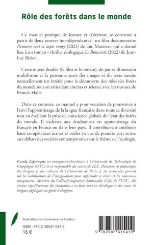 Ce manuel pratique de lecture et d’écriture se construit à partir de deux œuvres interdépendantes : un film documentaire Poumon vert et tapis rouge (2021) de Luc Marescot qui a donné lieu à un roman - thriller écologique Le Botaniste (2022) de Jean-Luc Bizien.