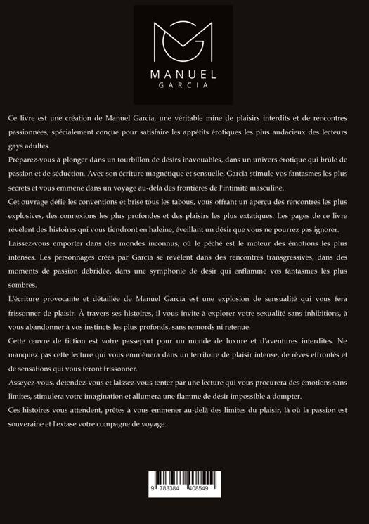 Ce livre est une création de Manuel Garcia, une véritable mine de plaisirs interdits et de rencontres passionnées, spécialement conçue pour satisfaire les appétits érotiques les plus audacieux des lecteurs gays adultes.Prépare-toi à te plonger dans un tourbillon de désirs inavouables, dans un univers érotique qui brûle de passion et de séduction. Avec son écriture magnétique et sensuelle, Garcia stimule tes fantasmes les plus secrets, t'emmenant dans un voyage au-delà des frontières de l'intimité masculine.Cet ouvrage défie les conventions et brise tous les tabous, t'offrant un aperçu des rencontres les plus explosives, des connexions les plus profondes et des plaisirs les plus extatiques. Les pages de ce livre révèlent des histoires qui te tiendront collé aux mots, éveillant un désir que tu ne pourras pas ignorer.Laisse-toi emporter dans des mondes inconnus, où le péché est le moteur des émotions les plus intenses. Les personnages créés par García se révèlent dans des rencontres transgressives, dans des moments de passion débridée, dans une symphonie de désir qui enflamme tes fantasmes les plus sombres.L'écriture provocante et détaillée de Manuel García est une explosion de sensualité qui te fera frissonner de plaisir. À travers ses histoires, il t'invite à explorer ta sexualité sans inhibitions, à t'abandonner à tes instincts les plus profonds, sans remords ni retenue.Cette oeuvre de fiction est ton passeport pour un monde de luxure et d'aventures interdites. Ne manque pas cette lecture qui t'emmènera dans un territoire de plaisir intense, de rêves effrontés et de sensations qui te feront frissonner.Assieds-toi, détends-toi et laisse-toi aller à une lecture qui te procurera des émotions sans limites, stimulera ton imagination et allumera une flamme de désir qui ne peut être apprivoisée.Ces histoires t'attendent, prêtes à t'emmener au-delà des limites du plaisir, là où la passion est souveraine et où l'extase est ton compagnon de voyage.