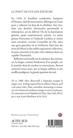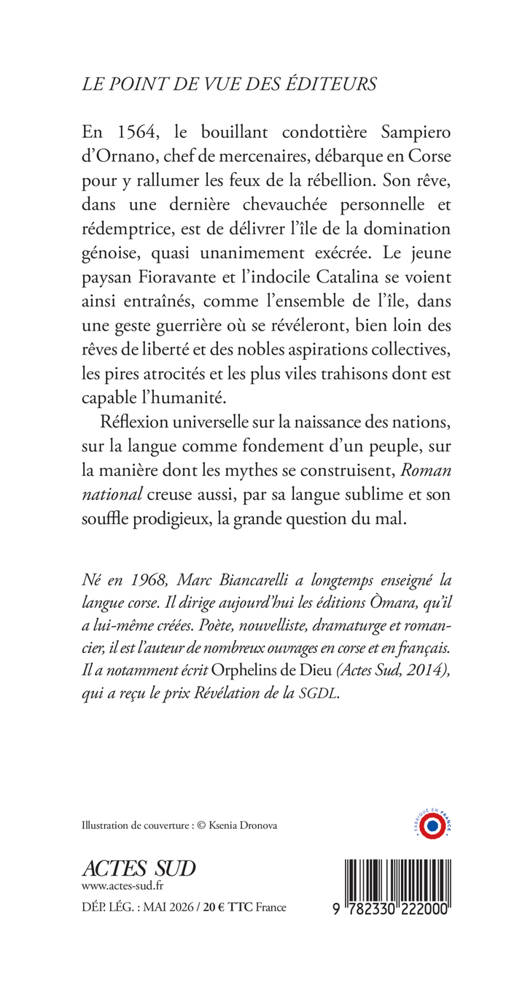 En 1564, le bouillant condottière Sampiero d'Ornano, chef de mercenaires, débarque en Corse pour y rallumer les feux de la rébellion. Son rêve, dans une dernière chevauchée personnelle et rédemptrice, est de délivrer l'île de la domination génoise, quasi unanimement exécrée. Le jeune paysan Fioravante et l'indocile Catalina se voient ainsi entraînés, comme l'ensemble de l'île, dans une geste guerrière où se révéleront, bien loin des rêves de liberté et des nobles aspirations collectives, les pires atrocités et les plus viles trahisons dont est capable l'humanité. Réflexion universelle sur la naissance des nations, sur la langue comme fondement d'un peuple, sur la manière dont les mythes se construisent, Roman national creuse aussi, par sa langue sublime et son souffle prodigieux, la grande question du mal.