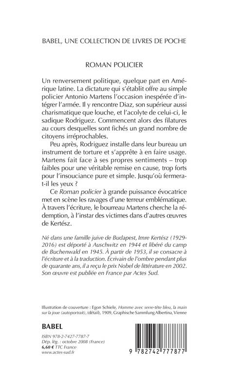 Un renversement politique, quelque part en Amérique latine. La dictature qui s'établit offre au simple policier Antonio Martens l'occasion inespérée d'intégrer l'armée. Il y rencontre Diaz, son supérieur aussi charismatique que louche, et l'acolyte de celui- ci, le sadique Rodriguez. Commencent alors des filatures au cours desquelles sont fichés un grand nombre de citoyens irréprochables. Peu après, Rodriguez installe dans leur bureau un instrument de torture et s'apprête à en faire usage. Martens fait face à ses propres sentiments - trop faibles pour une véritable remise en cause, trop forts pour l'insouciance pure et simple. Jusqu'où fermerat- il les yeux ? Ce Roman policier à grande puissance évocatrice met en scène les ravages d'une terreur emblématique. A travers l'écriture, le bourreau Martens cherche la rédemption, à l'instar des victimes dans d'autres oeuvres de Kertész. «Né en 1929 dans une famille juive de Budapest, Imre Kertész est déporté à Auschwitz en 1944 et libéré du camp de Buchenwald en 1945. Depuis 1953, il se consacre à l'écriture et à la traduction. Ecrivain de l'ombre pendant plus de quarante ans, il a reçu le prix Nobel de littérature en 2002. Son oeuvre est publiée en France par Actes Sud.»