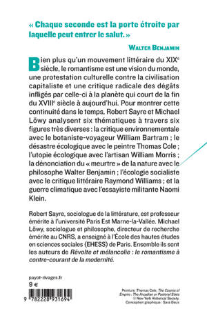Bien plus qu'un mouvement littéraire du XIXe siècle, le romantisme est une vision du monde, une protestation culturelle contre la civilisation capitaliste et une critique radicale des dégâts infligés par celle-ci à la planète qui court de la fin du XVIIIe siècle à aujourd'hui. Pour montrer cette continuité dans le temps, Robert Sayre et Michael Löwy analysent six thématiques à travers six figures très diverses : la critique environnementale avec le botaniste-voyageur William Bartram ; le désastre écologique avec le peintre Thomas Cole ; l'utopie écologique avec l'artisan William Morris ; la dénonciation du "meurtre" de la nature avec le philosophe Walter Benjamin ; l'écologie socialiste avec le critique littéraire Raymond Williams ; et la guerre climatique avec l'essayiste militante Naomi Klein.