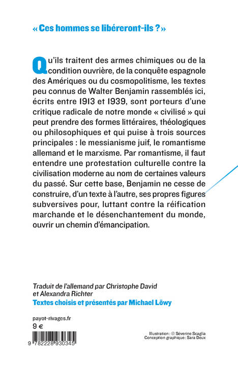 Grâce à sa diversité, ce recueil devrait permettre au lecteur de mieux percevoir les différents visages de Walter Benjamin, le critique littéraire toujours soucieux de ne pas séparer la littérature de l'histoire, le philosophe dont la pensée flânant loin des corpus consacrés affronte des problèmes souvent peu traités, le pêcheur de perles (selon Hannah Arendt) à qui son intimité avec la littérature allemande permet de sauver des textes aussi beaux que puissants et, enfin, le théoricien critique réfléchissant sur les tendances du présent au regard de l'émancipation. Si le présent volume est composé de textes de Walter Benjamin inédits en français ou introuvables, car publiés dans des revues confidentielles ou difficiles à consulter, il ne s'agit pas pour autant de curiosa. Ces essais, en effet, sont porteurs, à des degrés divers, d'une critique authentique et radicale de la civilisation capitaliste- industrielle moderne.