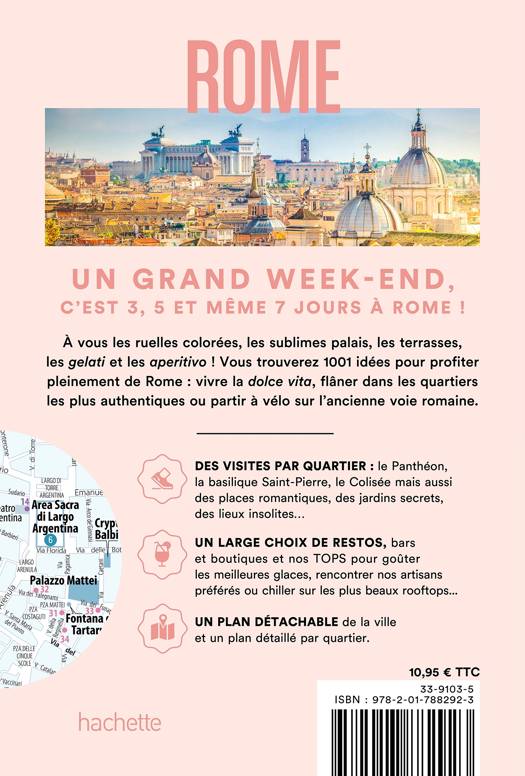 - Des expériences et activités uniques : dîner en musique à bord du TramJazz avec les monuments de Rome en toile de fond, fouler le sol mythique de Cinecittà, goûter à la street food dans le Testaccio, découvrir le quartier de Garbatella à Vespa sur les traces de Nani Moretti, se promener en barque sur le lac de la Villa Borghese… - Les visites des sites incontournables, des balades pour respirer. - Notre sélection de restos, bars avec terrasse, clubs et boutiques tendancepour profiter de la Dolce Vita. - Nos coups de cœur et nos « tops » pour aller à l’essentiel : les plus beaux points de vue depuis les collines de Rome, les meilleures adresses de glaciers et de street food, le top des lieux où prendre l’aperitivo, les terrasses et rooftops les plus sympas, les meilleurs spots pour danser, les boutiques les plus branchées… - Un plan détachable avec toutes les adresses localisées.