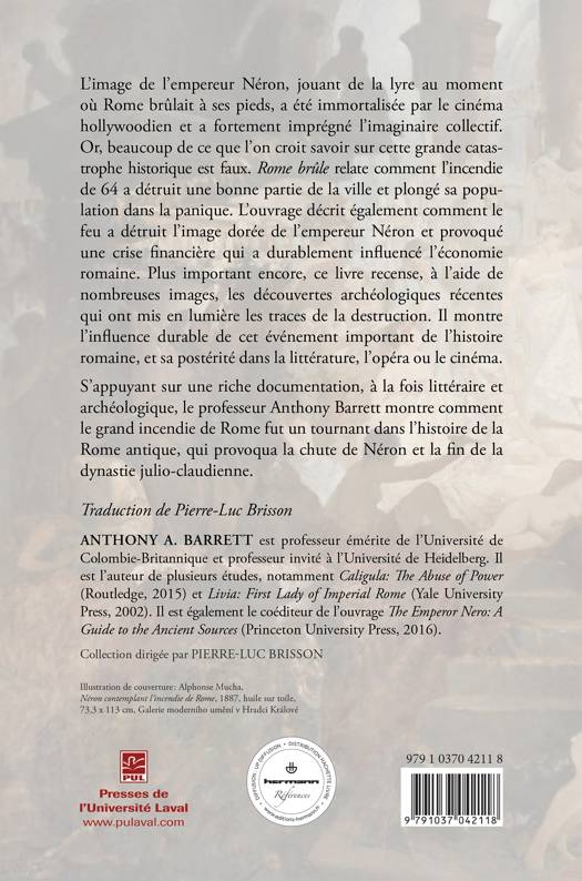 L’image de l’empereur Néron, jouant de la lyre au moment où Rome brûlait à ses L’image de l’empereur Néron, jouant de la lyre au moment où Rome brûlait à ses pieds, a été immortalisée par le cinéma hollywoodien et a durablement imprégné l’imaginaire collectif. Or, beaucoup de ce que l’on croit savoir sur cette grande catastrophe historique est faux. Rome brûle relate comment l’incendie de 64 a détruit une bonne partie de la ville et plongé sa population dans la panique. L’ouvrage décrit également comment le feu a détruit l’image dorée de l’empereur Néron, et provoqué une crise financière qui a durablement influé sur l’économie romaine. Ce livre recenseen outre les récentes découvertes archéologiques qui permettent de mieux comprendre cet événement, et sa postérité dans la littérature, l’opéra ou le cinéma. S’appuyant sur une riche documentation, à la fois littéraire et archéologique, le professeur Anthony Barrett montre comment le grand incendie de Rome provoqua la chute de Néron et la fin de la dynastie julio-claudienne, et fut un point de bascule dans l’histoire romaine.