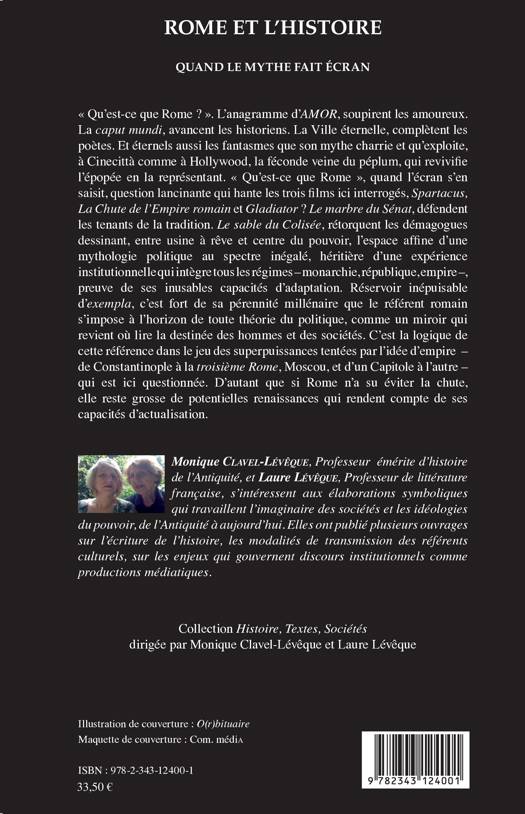 Le mythe de Rome charrie d'éternels fantasmes, qui sont exploités à Cinecittà comme à Hollywood par la féconde veine du péplum, qui revivifie l'épopée en la représentant. "Qu'est-ce que Rome" quand l'écran s'en saisit, question lancinante qui hante les trois films ici interrogés : Spartacus, La Chute de l'Empire romain et Gladiator ?