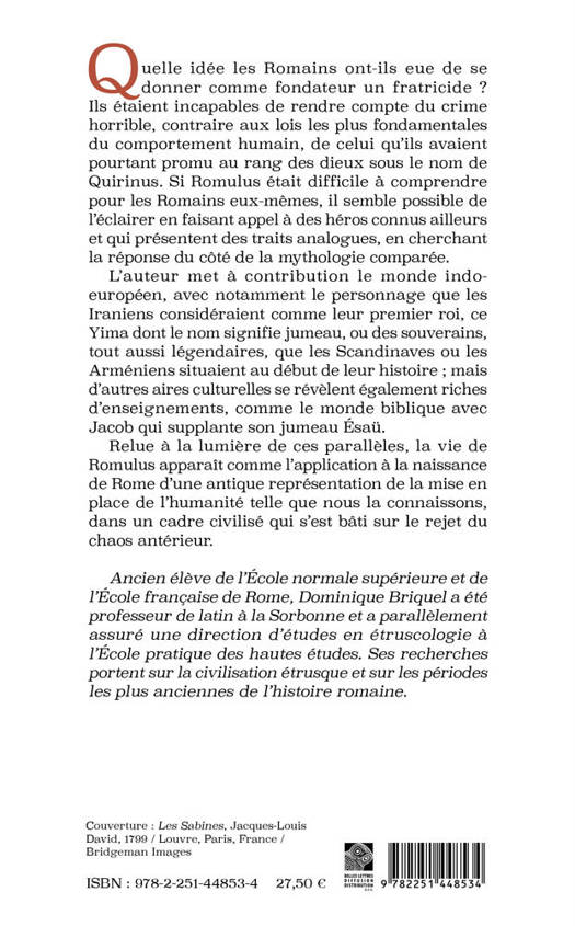 Quelle idee les Romains ont-ils eue de se donner comme fondateur un fratricide ? Ils etaient incapables de rendre compte du crime horrible, contraire aux lois les plus fondamentales du comportement humain, de celui qu'ils avaient pourtant promu au rang des dieux sous le nom de Quirinus. Si Romulus etait difficile a comprendre pour les Romains eux-memes, il semble possible de l'eclairer en faisant appel a des heros connus ailleurs et qui presentent des traits analogues, en cherchant la reponse du cote de la mythologie comparee. L'auteur met a contribution le monde indoeuropeen, avec notamment le personnage que les Iraniens consideraient comme leur premier roi, ce Yima dont le nom signifie jumeau, ou des souverains, tout aussi legendaires, que les Scandinaves ou les Armeniens situaient au debut de leur histoire; mais d'autres aires culturelles se revelent egalement riches d'enseignements, comme le monde biblique avec Jacob qui supplante son jumeau Esau. Relue a la lumiere de ces paralleles, la vie de Romulus apparait comme l'application a la naissance de Rome d'une antique representation de la mise en place de l'humanite telle que nous la connaissons, dans un cadre civilise qui s'est bati sur le rejet du chaos anterieur.