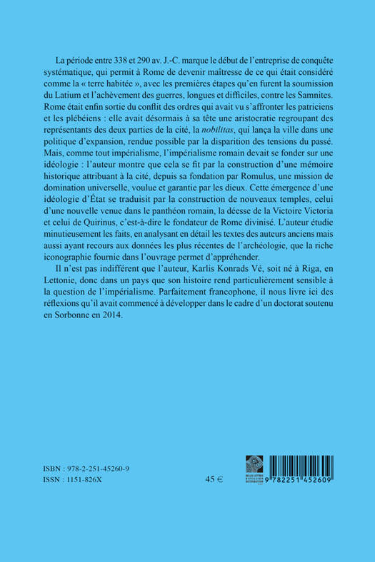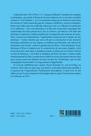 La periode entre 338 et 290 av. J.-C. marque le debut de l'entreprise de conquete systematique, qui permit a Rome de devenir maitresse de ce qui etait considere comme la terre habitee, avec les premieres etapes qu'en furent la soumission du Latium et l'achevement des guerres, longues et difficiles, contre les Samnites. Rome etait enfin sortie du conflit des ordres qui avait vu s'affronter les patriciens et les plebeiens: elle avait desormais a sa tete une aristocratie regroupant des representants des deux parties de la cite, la nobilitas, qui lanca la ville dans une politique d'expansion, rendue possible par la disparition des tensions du passe. Mais, comme tout imperialisme, l'imperialisme romain devait se fonder sur une ideologie: l'auteur montre que cela se fit par la construction d'une memoire historique attribuant a la cite, depuis sa fondation par Romulus, une mission de domination universelle, voulue et garantie par les dieux. Cette emergence d'une ideologie d'Etat se traduisit par la construction de nouveaux temples, celui d'une nouvelle venue dans le pantheon romain, la deesse de la Victoire Victoria et celui de Quirinus, c'est-a-dire le fondateur de Rome divinise. L'auteur etudie minutieusement les faits, en analysant en detail les textes des auteurs anciens mais aussi ayant recours aux donnees les plus recentes de l'archeologie, que la riche iconographie fournie dans l'ouvrage permet d'apprehender. Il n'est pas indifferent que l'auteur, Karlis Konrads Ve, soit ne a Riga, en Lettonie, donc dans un pays que son histoire rend particulierement sensible a la question de l'imperialisme. Parfaitement francophone, il nous livre ici des reflexions qu'il avait commence a developper dans le cadre d'un doctorat soutenu en Sorbonne en 2014.