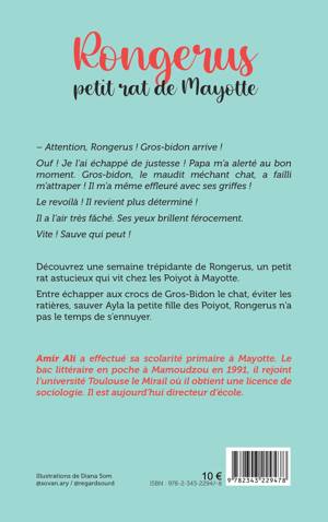 - Attention, Rongerus ! Gros-bidon arrive ! Ouf ! Je l’ai échappé de justesse ! Papa m’a alerté au bon moment. Gros-bidon, le maudit méchant chat, a failli m’attraper ! Il m’a même effleuré avec ses griffes ! Le revoilà ! Il revient plus déterminé !Il a l’air très fâché. Ses yeux brillent férocement. Vite ! Sauve qui peut ! Découvrez une semaine trépidante de Rongerus, un petit rat astucieux qui vit chez les Poiyot à Mayotte. Entre échapper aux crocs de Gros-Bidon le chat, éviter les ratières, sauver Ayla la petite fille des Poiyot, Rongerus n’a pas le temps de s’ennuyer.