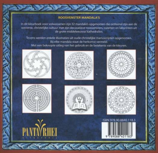 In dit kleurboek voor volwassenen zijn 32 mandala's opgenomen die ontleend zijn aan de westerse, christelijke cultuur met zijn decoratieve roosvensters, rozetten en labyrinten uit de grote middeleeuwse kathedralen. Tevens werden enkele illustraties uit oude christelijke manuscripten opgenomen. Bij elke mandala staat de herkomst vermeld op de achterkant van de tekening. Met een beknopte uitleg van de betekenis van de kleuren.